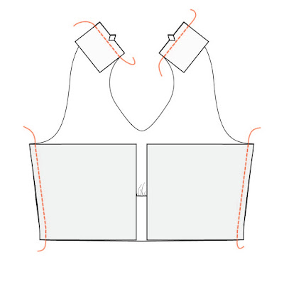 Sew the interfaced back strap pieces to the straps and sew the back bodice pieces to the front bodice.