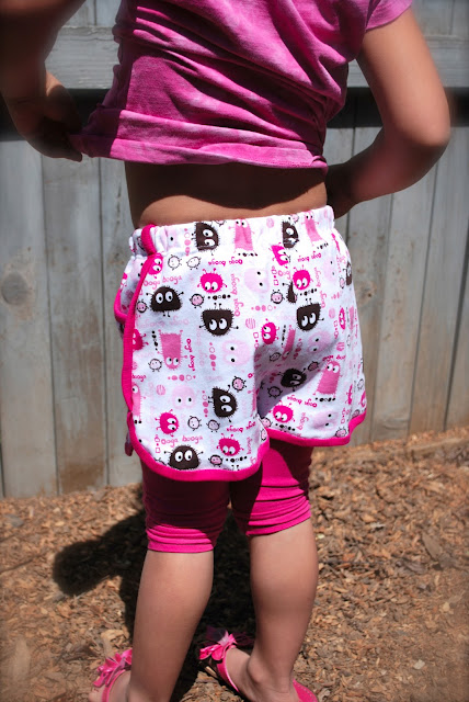 The pattern really lend itself nicely to knit fabric. It has a classic, comfy style...with a wonderful retro feel. I made a size 4 length with a size 3 width for my little booty girl. It gives her lots of freedom of movement. Which she gladly demonstrated when I asked her to show me the side.