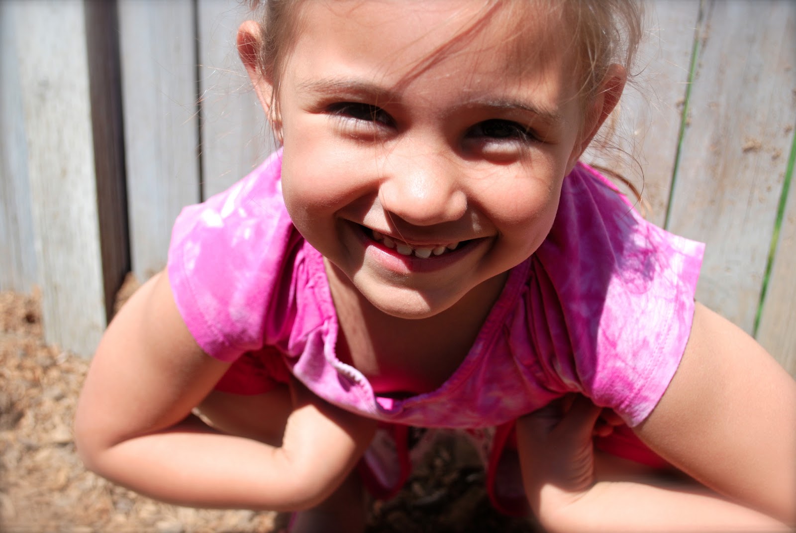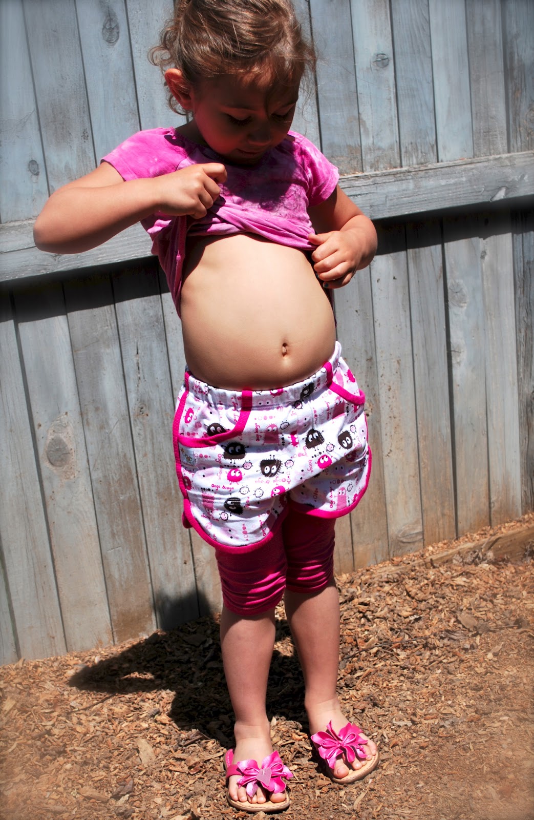 The pattern really lend itself nicely to knit fabric. It has a classic, comfy style...with a wonderful retro feel. I made a size 4 length with a size 3 width for my little booty girl. It gives her lots of freedom of movement. Which she gladly demonstrated when I asked her to show me the side.